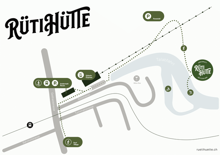 About 5 minutes from the Rossstall parking lot (50 meters). About 10 minutes (150 meters) from the Gütsch-Express valley station. Through the tunnel at the Gütsch-Express valley station, follow the path to the left until you reach the Rossstall parking lot, then directly to the hut. It is about 15 minutes from the Radisson Blu Hotel via the train station.